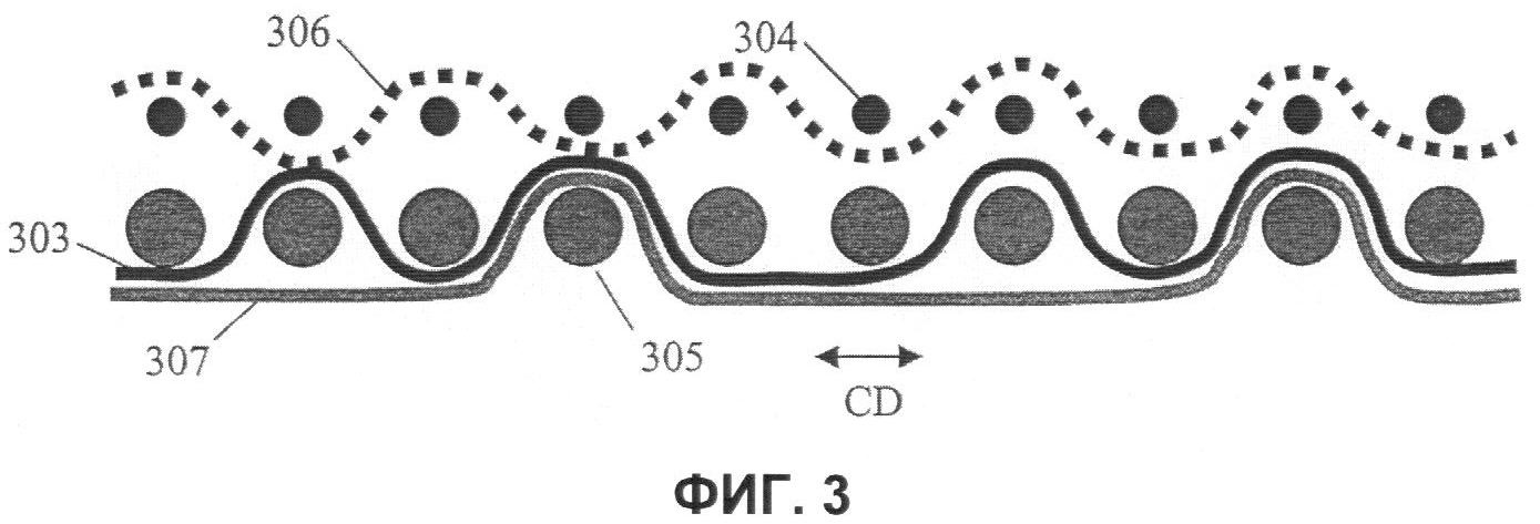 Фиг.3 представляет собой изображение поперечного сечения в направлении CD-нитей, на котором показана альтернативная конфигурация второй системы CD-нитей для другого примера трехслойной ткани, предлагаемой в соответствии с настоящим изобретением. Для данной ткани вторая система включает третью CD-нить 303, которая соединяется со слоем стороны износа ткани (но не является его частью), четвертую CD-нить 306, которая образует простое тканое переплетение с MD-нитями 304 формовочного слоя, и пятую CD-нить 307, которая переплетается с MD-нитями 305 слоя стороны износа ткани. Пропускание третьей CD-нити 303 через нижний слой способствует предотвращению выскальзывания указанной нити из ее положения в TSS-структуре тканого переплетения. Следует отметить, что для сохранений TSS-структуры третья CD-нить 303 всегда остается расположенной между четвертой и пятой CD-нитями.