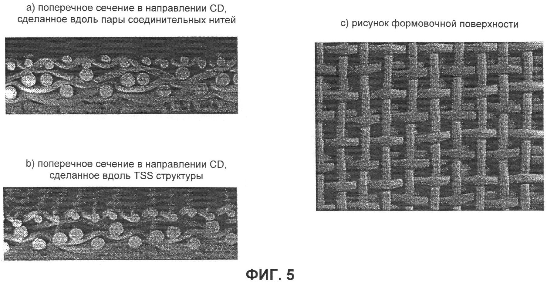 На Фиг.5 изображено: а) поперечное сечение в направлении CD-нитей, сделанное вдоль пары соединительных нитей, b) поперечное сечение в направлении CD-нитей, сделанное вдоль TSS-структуры, и с) рисунок формовочной поверхности примера трехслойной ткани, показанной на Фиг.3.