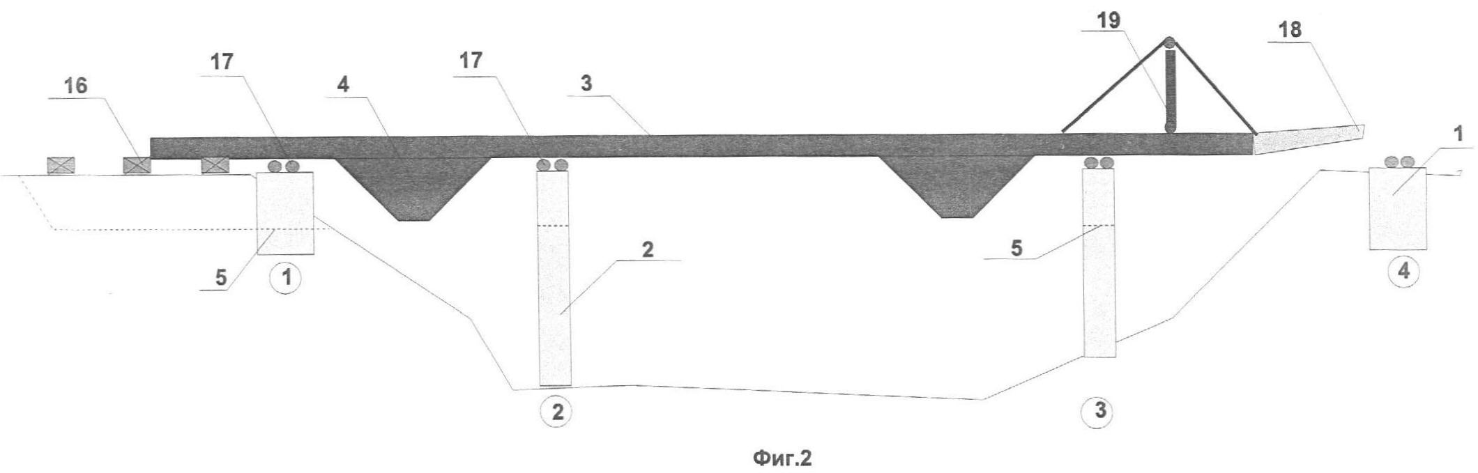 Металлическое коробчатое пролетное строение 3 собирают следующим образом. На подходе к мосту устраивают стапель 16 с толкающим устройством (на чертеже не показано), а на оголовках устоев 1 и промежуточных опор 2 устанавливают пути катания 17. На стапеле 16 собирают участки металлического коробчатого пролетного строения 3 на полную высоту, включая приопорные участки 4, пристыковывают к консоли аванбек 18 и осуществляют их надвижку в пролет с опиранием на пути катания 17. В случае необходимости, для усиления надвигаемого коробчатого металлического пролетного строения 3 на его консоли устанавливают шпренгель 19. Наличие в оголовках устоев 1 и промежуточных опор 2 продольных проемов 5 обеспечивает при надвижке свободный проход сквозь них нижнего яруса, образующего приопорные участки увеличенной высоты 4.