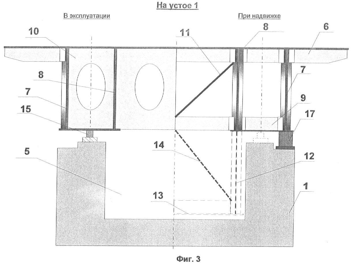 на Фиг.3 изображен верхний ярус пролетного строения с опиранием на оголовок устоя как в период эксплуатации, так и в период надвижки;