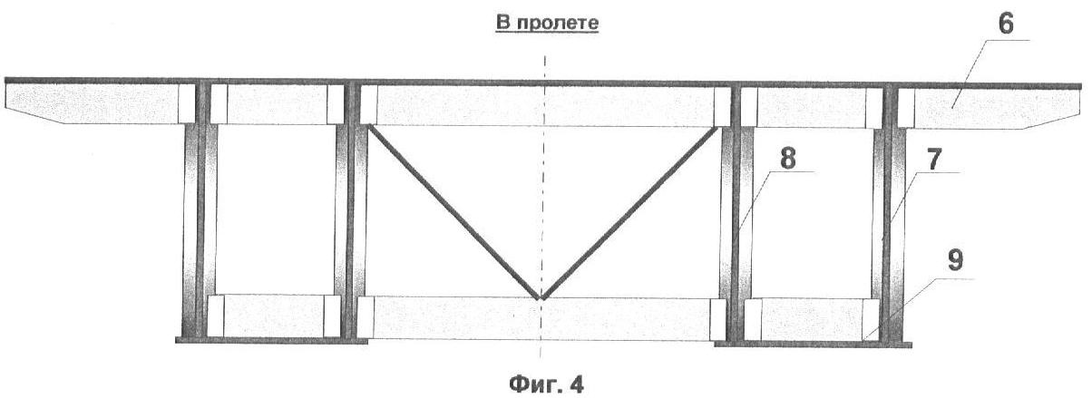 на Фиг.4 изображен верхний ярус пролетного строения, поперечное сечение в пролете;