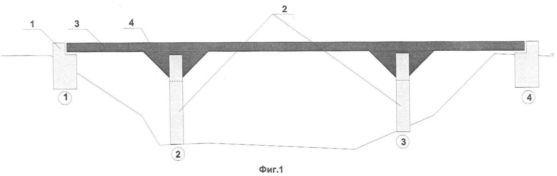 В оголовках устоев 1 и промежуточных опор 2 выполнены продольные проемы 5, глубина которых равна высоте приопорных участков 4.