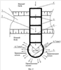 2. Конструкция вплывного отверстия входного оголовка рыбохода, включающая низовую часть рыбоходного тракта с входной разделительной стенкой, образующей входной оголовок рыбохода, и расположенным в ней по всей длине входной разделительной стенки входного оголовка рыбохода вплывным отверстием, при этом по периметру вплывного отверстия расположены струеобразующие насадки под углом или параллельно оси отверстия, оснащенного заградительным козырьком таким образом, что насадки находятся внутри сформированной козырьком выходной части вплывного отверстия и расположены параллельно плоскости экранирующей стенки прилегающего заградительного козырька, причем сама входная разделительная стенка выполнена в плане по дуге окружности с образованием цилиндрической поверхности, а вплывное отверстие имеет форму, представляющую собой в проекции на плоскость, ортогональную вектору, лежащему на пересечении диагоналей отверстия и ортогональному оси цилиндра, прямоугольника, отличающаяся тем, что вплывное отверстие выполнено в форме, представляющей собой в проекции на плоскость, ортогональную вектору, проходящему через точку пересечения диаметров вплывного отверстия и перпендикулярному к этим диаметрам, а также перпендикулярному к оси цилиндрической поверхности входной разделительной стенки рыбохода, фигуру в виде окружности.