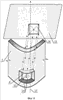 3. Конструкция вплывного отверстия входного оголовка рыбохода, включающая низовую часть рыбоходного тракта с входной разделительной стенкой, образующей входной оголовок рыбохода, и расположенным в ней по всей длине входной разделительной стенки входного оголовка рыбохода вплывным отверстием, при этом по периметру вплывного отверстия расположены струеобразующие насадки под углом или параллельно оси отверстия, оснащенного заградительным козырьком таким образом, что насадки находятся внутри сформированной козырьком выходной части вплывного отверстия и расположены параллельно плоскости экранирующей стенки прилегающего заградительного козырька, причем сама входная разделительная стенка выполнена в плане по дуге окружности с образованием цилиндрической поверхности, а вплывное отверстие имеет форму, представляющую собой в проекции на плоскость, ортогональную вектору, лежащему на пересечении диагоналей отверстия и ортогональному оси цилиндра, прямоугольника, отличающаяся тем, что вплывное отверстие выполнено в форме, представляющей собой в проекции на плоскость, ортогональную вектору, проходящему через точку пересечения большой криволинейной оси и малой оси вплывного отверстия и перпендикулярному к малой оси этого вплывного отверстия, а также перпендикулярному к оси цилиндрической поверхности входной разделительной стенки рыбохода, фигуру в виде эллипса.
