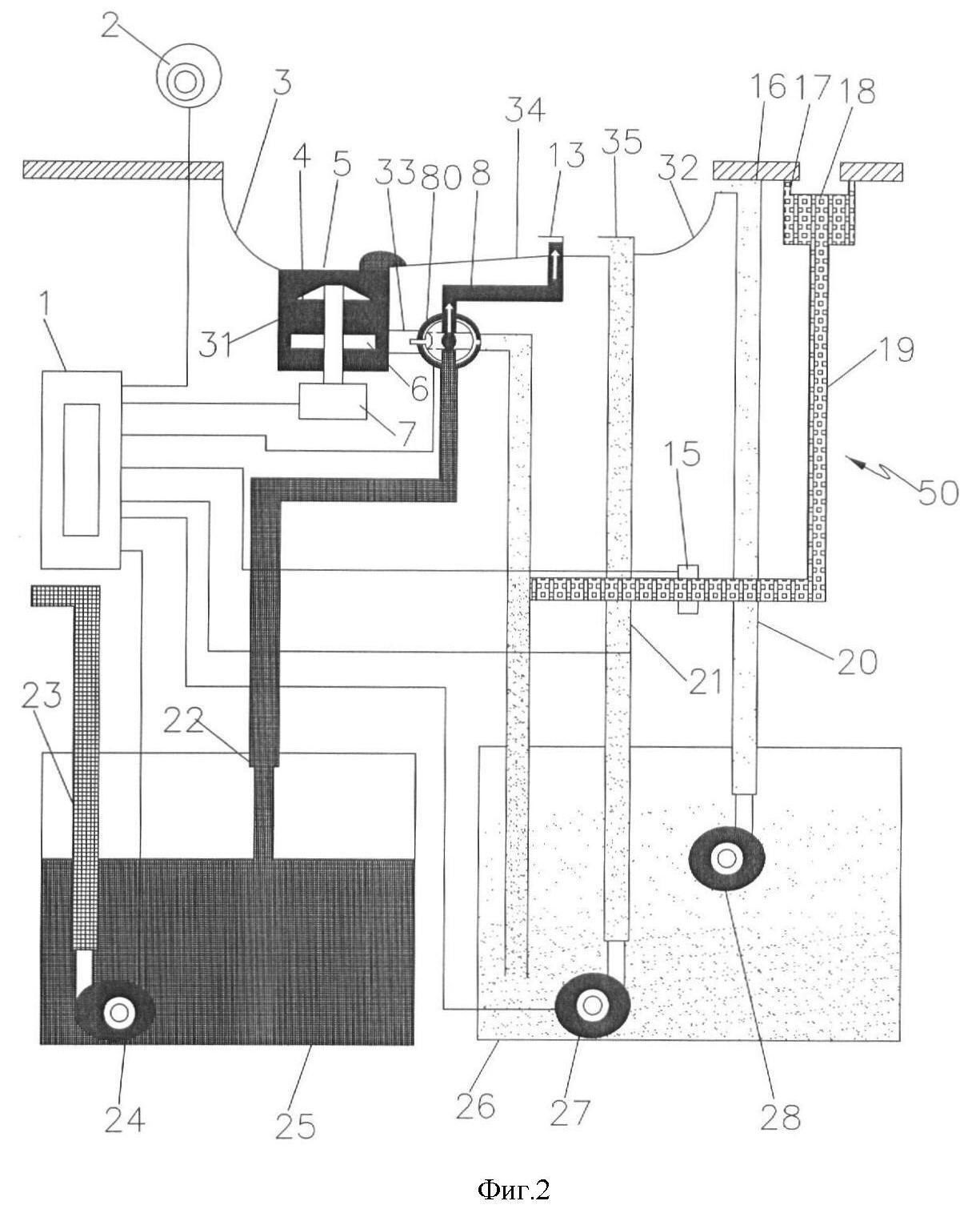 На фиг.2 показан второй пример осуществления настоящего изобретения безводного смывного устройства туалета со смывным насосом по настоящему изобретению. По сравнению с безводным смывным туалетом со смывным насосом, изображенным на фиг.1, безводный смывной туалет со смывным насосом, изображенный на фиг.2, снабжен смывным насосом смывной жидкости нижнего уровня 27 и трубопровод смывной жидкости нижнего уровня 21, соединенный с выходом смывного насоса смывной жидкости нижнего уровня 27. Смывной насос смывной жидкости нижнего уровня 27 установлен в камере сбора смывной жидкости 26 и находится в смывной жидкости нижнего уровня. Выход трубопровода 21 соединен с открытым смывным концом 35 в средней части 34 унитаза. Электродвигатель смывного насоса смывной жидкости нижнего уровня 27 подключен к устройству управления контуром 1.