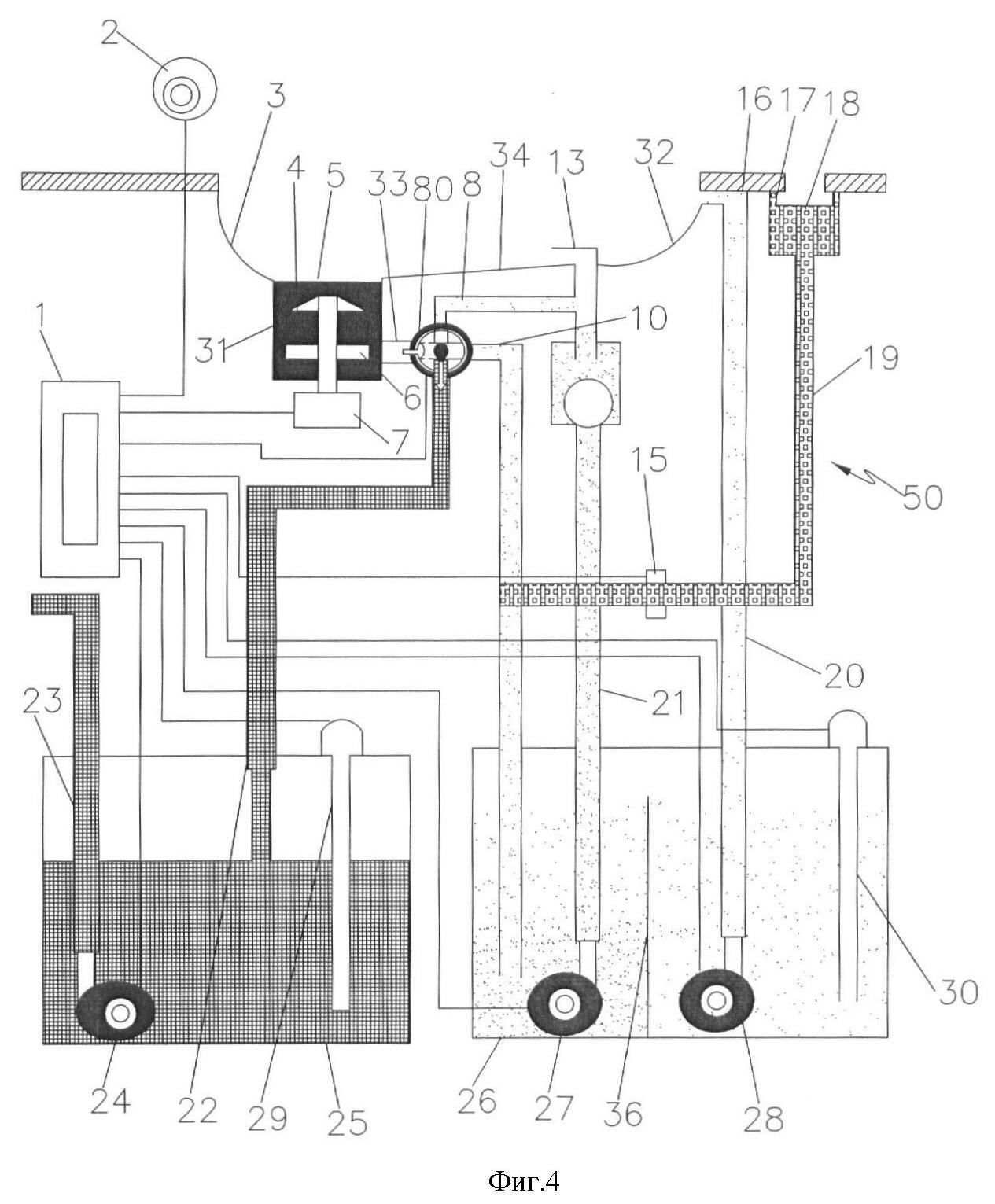 На фиг.4 показан четвертый пример осуществления настоящего изобретения безводного смывного устройства туалета со смывным насосом по настоящему изобретению. По сравнению с безводным смывным устройством туалета со смывным насосом, изображенным на фиг.3, отличие состоит в том, что в камере сбора смывной жидкости 26 установлена пластина перелива 36, и смывной насос смывной жидкости нижнего уровня 27, и смывной насос смывной жидкости верхнего уровня 28 в камере сбора смывной жидкости 26 установлены слева или справа от пластины перелива 36 соответственно. Труба-коллектор урины 10 установлена слева от пластины перелива 36 у днища камеры сбора смывной жидкости 26. Путем соответствующей регулировки пластины перелива 36 в камере сбора смывной жидкости 26 можно поступившую сверху смывную жидкость верхнего уровня слева от пластины перелива 36 переливать в емкость справа от пластины перелива 36 через эту пластину. Поступившая сверху смывная жидкость верхнего уровня более всего подходит для использования в качестве конечной смывной жидкости, когда безводное смывное устройство туалета со смывным насосом по настоящему изобретению работает постоянно. Кроме этого, поскольку поступившая сверху смывная жидкость верхнего уровня справа от пластины перелива 36 больше не накапливается, то не нужно устанавливать смывной насос смывной жидкости верхнего уровня 28 в верхнюю часть смывной жидкости. Тогда можно избежать ситуации, при которой смывной насос смывной жидкости верхнего уровня 28 не может откачивать смывную жидкость, так как уровень поступившей сверху смывной жидкости верхнего уровня понизился.