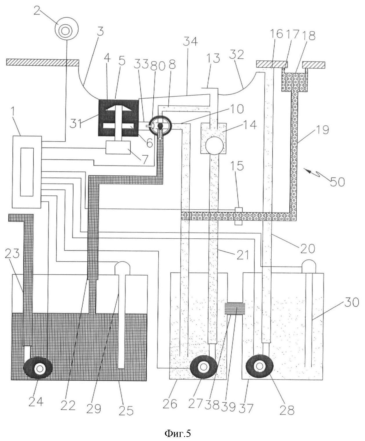 На фиг.5 показан пятый пример осуществления настоящего изобретения безводного смывного устройства туалета со смывным насосом по настоящему изобретению. По сравнению с безводным смывным устройством туалета со смывным насосом, изображенным на фиг.4, отличие состоит в том, что камера сбора смывной жидкости 26 разделена на левый коллектор смывной жидкости и правый коллектор смывной жидкости, которые в верхней части камеры соединены друг с другом через промежуточную трубку 38. На месте канала, образованного промежуточной трубкой 38, может устанавливаться модуль обработки урины 39, который производит ее фильтрацию, обесцвечивание, очистку, дезинфекцию, сепарацию загрязнений и т.д. Смывной насос смывной жидкости нижнего уровня 27 и смывной насос смывной жидкости верхнего уровня 28 устанавливаются внутри или снаружи левой и правой камер сбора смывной жидкости соответственно. У днища камеры сбора смывной жидкости 26 труба-коллектор урины 10 соединена с левой камерой сбора смывной жидкости и датчик уровня жидкости 30 камеры сбора смывной жидкости установлен в правой камере сбора смывной жидкости. Таким образом, поступившая сверху смывная жидкость верхнего уровня в левой камере сбора смывной жидкости может перетекать в правую камеру сбора смывной жидкости через промежуточную трубку 38, Поступившая сверху смывная жидкость верхнего уровня более всего подходит для использования в качестве конечной смывной жидкости, когда безводное смывное устройство туалета со смывным насосом по настоящему изобретению работает постоянно. Кроме этого, поскольку поступившая сверху смывная жидкость верхнего уровня, перетекающая в правую камеру сбора смывной жидкости, больше не накапливается, то не нужно устанавливать смывной насос смывной жидкости верхнего уровня 28 в верхней части смывной жидкости. Тогда можно избежать ситуации, при которой смывной насос смывной жидкости верхнего уровня 28 не может больше смывную жидкость, так как уровень поступившей сверху смывной жидкости верхнего уровня понизился. В противном случае, как показано на фиг.4 для четвертого примера осуществления настоящего изобретения, поскольку поступившая сверху смывная жидкость верхнего уровня слева от пластины перелива 36 переливается в емкость справа от пластины перелива 36 через саму эту пластину, то вместе с ней в емкость справа от пластины перелива 36 переливается и большое количество пены смывной жидкости. Это приводит к погрешности определения уровня жидкости датчиком уровня жидкости 30 камеры сбора смывной жидкости. Но, как показано на фиг.5 для пятого примера осуществления настоящего изобретения, возможность появления такой проблемы уменьшается. Кроме того, в промежуточной трубе 38 можно устанавливать модуль обработки урины 39, и он может обрабатывать урину, например, подвергать ее фильтрации, обесцвечиванию, очистке, дезинфекции, сепарации загрязнений и т.д. И затем при использовании безводного смывного устройства туалета со смывным насосом по настоящему изобретению можно получить такой же хороший эффект, как и при использовании туалета со смывом водой.