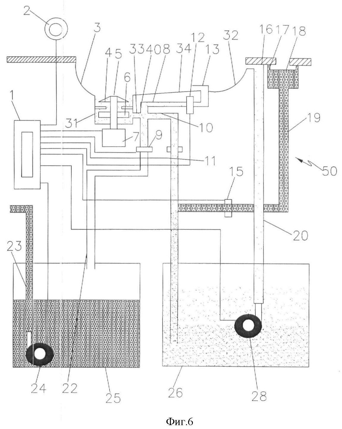 На фиг.6, показано, что, как только срабатывает безводное смывное устройство туалета и начинается дефекация или мочеиспускание, по сигналу начала дефекации или мочеиспускания, посланному устройством обнаружения, устройство управления контуром 1 начинает отсчет времени 2. При дефекации или мочеиспускании устройство управления контуром 1 открывает магнитный клапан 11 коллектора урины, и урина через устройство диспергатора и центрифуги 5 и трубу-коллектор урины 10 поступает в камеру сбора смывной жидкости 26. Урина и фекальные массы разделяются. В процессе сбора урины устройство управления контуром 1 открывает магнитный клапан дозирования медицинского препарата, что позволяет жидкому медицинскому препарату 18 из бачка с медицинским препаратом 17 поступать в трубу-коллектор урины 10 через подводящий патрубок жидкого медицинского препарата 19, и смешиваться с собранной уриной, а затем эта смесь поступает в камеру сбора смывной жидкости 26, где жидкость с медицинским препаратом становится смывной жидкостью. Когда пользователь покидает туалет, устройство управления контуром 1 с помощью программы идентификации по сигналу завершения дефекации или мочеиспускания, посланному устройством обнаружения 2, определяет, что было мочеиспускание, и тогда включается электродвигатель 7 смывного насоса смывной жидкости верхнего уровня 28 и электродвигатель устройства диспергатора и центрифуги 5 и смывная жидкость верхнего уровня из камеры сбора смывной жидкости 26 начнет перекачиваться смывным насосом смывной жидкости верхнего уровня 28 в открытый конец 16 в передней части 32 унитаза 3, и обеспечивает смыв. Затем она вместе с уриной засасывается в углубление 31 в задней части унитаза 3 для сбора фекальных масс под действием рабочего колеса 6 устройства диспергатора и центрифуги 5. А затем она откачивается в трубу-коллектор урины 10 через выход 33 в боковой стенке углубления 31 в задней части унитаза и стекает обратно в камеру сбора смывной жидкости 26. В случае дефекации, устройство управления контуром 1 закрывает магнитный клапан трубы-коллектора урины 11 и включает смывной насос смывной жидкости верхнего уровня 28 и держит его некоторое время включенным. Смывная жидкость из камеры сбора смывной жидкости 26 откачивается смывным насосом смывной жидкости верхнего уровня 28 и подается в открытый конец 16 в передней части 32 унитаза 3 по трубе смывной жидкости 20 и в унитаз 3. После этого, устройство управления контуром 1 включает электродвигатель 7 устройства диспергатора и центрифуги 5 и открывает магнитный клапан трубы диспергированных фекальных масс 12, и фекальные массы диспергируются в чаше с диспергатором 4 устройства диспергатора и центрифуги 5, и фекальные массы смешиваются со смывной жидкостью и превращаются в кашеобразную массу. При включении рабочего колеса 6 устройства диспергатора и центрифуги 5 осуществляется принудительная циркуляция по кольцевому каналу, образованному унитазом 3 и углублением 31 в задней части унитаза 3 для сбора фекальных масс, и по трубе диспергированных фекальных масс 8. После этого устройство управления контуром 1 закрывает магнитный клапан трубы диспергированных фекальных масс 12 и открывает магнитный клапан трубы-коллектора фекальных масс 9, что обеспечивает переток кашеобразной массы фекальных масс в камеру сбора ф