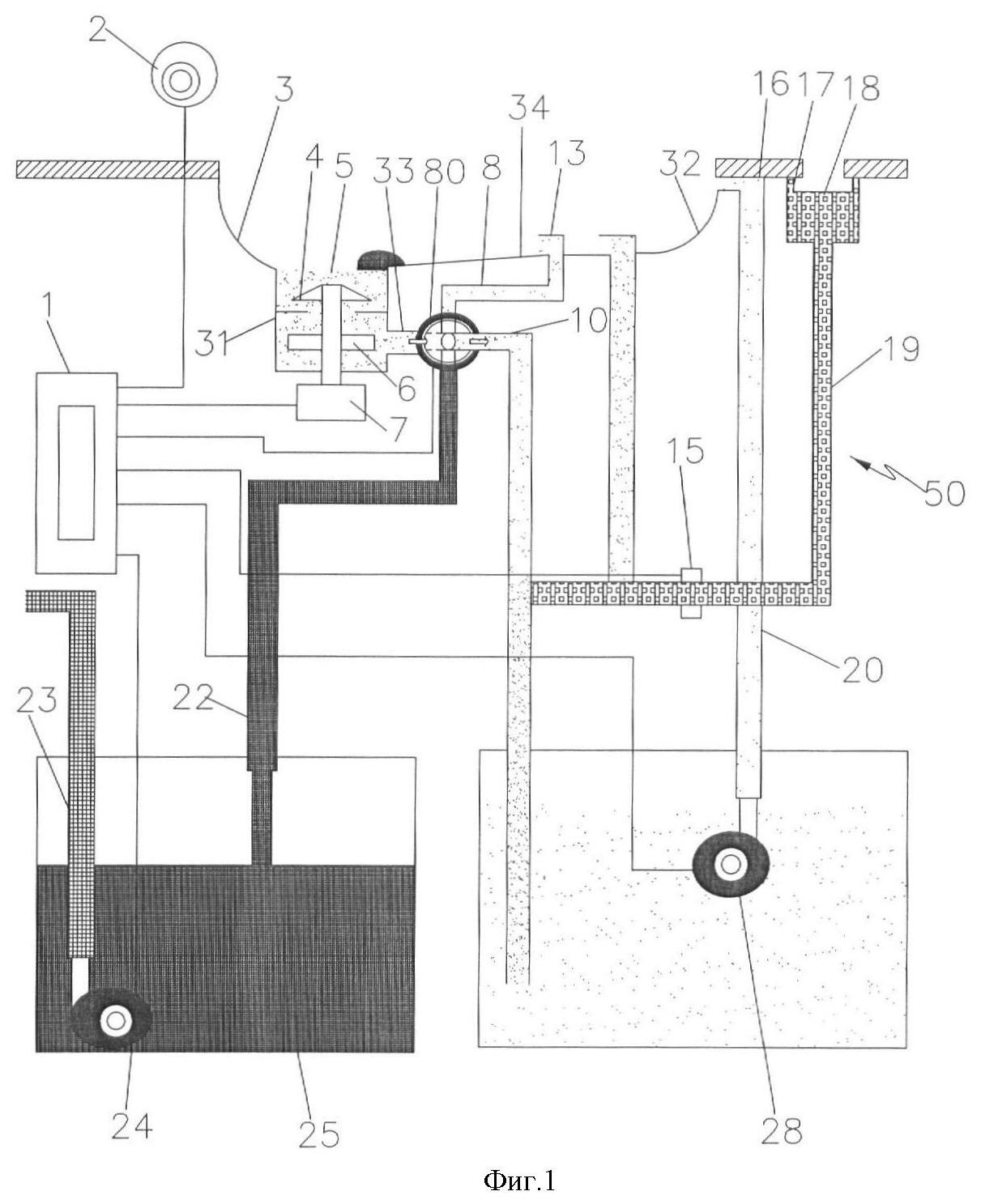 В состав устройства диспергатора и центрифуги 5 входит чаша с диспергатором 4 и рабочее колесо центрифуги 6, установленное на том же валу, и электродвигатель 7, который установлен в углублении 31 унитаза, для привода вала. Смывной насос смывной жидкости верхнего уровня 28 установлен внутри или снаружи камеры смывной жидкости 26, что позволяет легче откачивать смывную жидкость верхнего уровня. Выход смывного насоса смывной жидкости верхнего уровня соединен через трубопровод 20 с открытым концом 16 на передней стороне 32 унитаза 3. В состав трубопроводов входит труба диспергированных фекальных масс 8 и установленный на ней магнитный клапан 12, труба-коллектор фекальных масс 22 и установленный на ней магнитный клапан коллектора фекальных масс 9 и труба-коллектор урины 10 и установленный на ней магнитный клапан 11. Входы трубы диспергированных фекальных масс 8, трубы-коллектора фекальных масс 22 и трубы-коллектора урины 10 соединены с выходом 33 в боковой стенке углубления 31 в задней части унитаза для сбора фекальных масс через четырехходовую соединительную муфту 40, а выход соединен с открытым концом 13 средней части 34 унитаза, камерой сбора фекальных масс 25 и камерой сбора смывной жидкости 26 соответственно. В состав автоматического устройства дозирования дезодорирующей жидкости 50 входит бачок с медицинским препаратом 17, подводящий патрубок медицинского препарата 19, один конец которого соединен с днищем бачка с медицинским препаратом 17, а другой конец соединен с трубой-коллектором урины 10 и магнитным клапаном дозирования медицинского препарата 15, установленным на подводящем патрубке медицинского препарата 19. Вход насоса отвода фекальных масс 24 соединен с днищем камеры сбора фекальных масс 25, а его выход соединен с трубой отвода фекальных масс 23, выходящей из камеры сбора фекальных масс 25, а выход трубы отвода фекальных масс 23 соединен с контейнером-накопителем. Устройство управления контуром 1 подключено к электродвигателю 7, смывному насосу смывной жидкости верхнего уровня 28 и электродвигателю насоса отвода фекальных масс 24, магнитному клапану трубы диспергированных фекальных масс 12, магнитному клапану трубы-коллектора фекальных масс 9, магнитному клапану трубы-коллектора урины 11, магнитному клапану дозирования медицинского препарата 15 и устройству обнаружения человека 2. В качестве устройства управления контуром 1 используется однокристальный компьютер (common chip computer). Устройство обнаружения человека 2 монтируется в соответствующем месте в туалете и используется для преобразования сигнала наличия или отсутствия человека в туалете в электрический сигнал и затем передает его на вход устройства управления контуром 1. В качестве устройства обнаружения человека 2 может использоваться фотоэлектрическое устройство обнаружения, устанавливаемое в туалете, а также пассивный датчик инфракрасного излучения человека, или датчик давления, устанавливаемый под полом туалета, а также позиционно-чувствительный выключатель, устанавливаемый на замке или задвижке туалета, или устройство обнаружения любого другого вида, только если его состояние указывает на присутствие или отсутствие человека в туалете. Например, поскольку пользователь входит в туалет, тело человека будет загораживать или отражать свет, исходящий из фотоэлектрическог