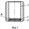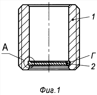 Вовнутрь пустотелого корпуса 1 вставляют донышко 2, устанавливают эту сборочную единицу на матрицу 7 с выступающей цилиндрической частью «Д», надавливают пуансоном 8 до пластической деформации и получения радиального расширения донышка 2 и заполнения канавки «Г» (фиг.9). Для второго варианта (фиг.7) под донышко 2 устанавливают кольцо 5 и запрессовывают одновременно донышко 2 и кольцо 5.