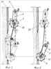 1 – подвеска НКТ; 2 – муфта НКТ шарнирного узла; 3 – корпус; 4 – муфта корпуса; 5 – дисковая фреза; 6 – режущий узел; 7 – привод фрезы; 8 – кинематическая связь от привода 7 к фрезе 5; 9 – ось режущего узла 6; 10 – ось фрезы; 11 – отжимной ролик; 12 – механизм подачи отжимного ролика; 13 – гидроцилиндр механизма подачи режущего узла 6; 14 – поршень со штоком гидроцилиндра 13; 15 – тяга от штока к режущему узлу; 16 – клапан одностороннего действия; 17 – дроссельное отверстие; 18 – канал гидравлической связи подпоршневой полости гидроцилиндра 13 с рабочей полостью; 19 и 20 – ролики верхнего и нижнего опорных участков корпуса 3 соответственно; 21 – оси роликов; 22 – обсадная колонна.