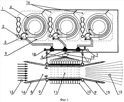 На фиг.1 показана конструктивная схема двигателя; на фиг.2 – общий вид этого двигателя. Плазменно-ионный комбинированный воздушно-реактивный двигатель содержит: каскадные нейтронные умножители 1, накопитель нейтронов 2, импульсный подкритический ядерный реактор 3, кольцевой генератор 4, узел наложения магнитного поля 5, ионизирующую камеру 6, узел подачи рабочей среды 7 для образования плазмы 8, кольцевой канал 9 подачи рабочей среды, ускоритель заряженных частиц 10, разгоняемые ионизированные частицы плазмы 11, в рабочем канале образовавшуюся высокоскоростную струю 12, где набегающий в канал 11 поток воздуха 13 смешивается с высокоионизированными частицами плазмы в объеме струи (фиг.1), диффузор 14(15) и конфузор 15(14) для работы двигателя в реверсивных направлениях. Двигатель содержит несколько энергоблоков 16 для набора мощности. Управляемые клапаны 17 служат для изменения подачи рабочей среды в тот-9 или иной-9 канал, а также имеет переключатель 18 подачи рабочей среды и переключатель 19 ускорителя 10 для реверсивной роботы двигателя и изменения направления тяги.