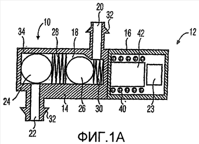 Корпус 14 насосной секции определяет насосную камеру 18, впуск 20 и выпуск 22. Корпус 14 насосной секции может быть выполнен с низкой стоимостью, например, путем инжекционного формования пластмассы, при этом впуск 20 и выпуск 22 могут быть инжектированы. Первый шар 24, представляющий первый подвижный элемент, и второй шар 26, представляющий второй подвижный элемент, находятся в насосной камере 18. Пружина 28 находится между шарами 24 и 26. Вторая пружина 30 находится между вторым шаром 26 и корпусом 14 насосной секции. Первая пружина 28 и вторая пружина 30 смещают первый шар 24 и второй шар 26 в позиции, показанные на фиг.1А. В показанном варианте пружины 28 и 30 выполнены в виде винтовых пружин.