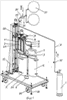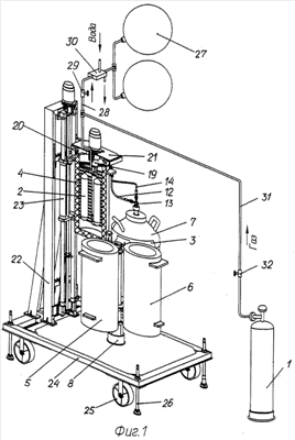 Для всех вариантов баллоны-компрессоры 2 и источник формирования потока жидкого теплоносителя (мешалки) 19 в емкости 4 подвешены на крышке 20. Для третьего варианта важно взаимное расположение баллонов-компрессоров 2 и мешалки 19. Баллоны-компрессоры 2 подвешены на крышке 20, вне проекции теплоносителя на крышку, а мешалка 19 подвешена между баллонами-компрессорами и этой проекцией. Крышка 20 в процессе термоциклирования баллонов-компрессоров 2 стыкуется поочередно с емкостями 4, 5, 6 и прикреплена к кронштейну 21 в верхней части стойки 22 подъемного механизма 23, расположенного совместно с установочным устройством 8, закрепленным с возможностью вращения на платформе 24, снабженной устройствами для ее перемещения, например колесами 25, и для фиксации, например домкратами 26. Установочное устройство 8 выполнено в виде вращающейся вокруг своей оси цилиндрической стойки (барабана), на которой посредством разъемных (съемных) кронштейнов закреплены разнотемпературные емкости 4, 5, 6, при этом данное установочное устройство 8 при вращении обеспечивает поочередную установку емкостей 4, 5, 6 под крышкой 20. Кроме того, установочное устройство 8 имеет площадку, прикрепленную к вращающейся цилиндрической стойке, для размещения и крепления сосуда Дьюара 7, который вращается совместно с емкостями 4, 5, 6, что исключает его отстыковку (пристыковку) от теплообменника 101, 102, 103 низкотемпературной емкости 4 в процессе работы и сокращает длину металлорукавов. Подъемный механизм 23 обеспечивает поочередный подъем (спуск) каждой емкости 4, 5, 6 после ее установки под крышкой 20. Для повышения эффективности теплообмена теплоносителя с баллонами-компрессорами 2 и теплообменником 101, 102, 103 на крышке 20 закреплено устройство, формирующее (побуждающее) циркуляцию теплоносителя в емкости 4, 5, 6, которое включают в работу после погружения данного устройства в теплоноситель и стыковки крышки 20 поочередно с емкостями 4, 5, 6.