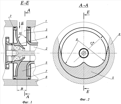 Изобретение поясняется чертежами, где на Фиг.1 дан продольный разрез устройства по сечению Е-Е, на Фиг.2 – сечение А-А, на Фиг.3 – вид Б. Входное устройство насоса включает в себя кольцевой диффузорный участок 1 и цилиндрический участок на выходе из устройства 2. В отличие от известных решений кольцевой диффузорный участок 1 выполнен из переднего 3 и заднего 4 осесимметричных обтекателей и установленного между ними соосного цилиндрического вкладыша 5. Во вкладыше 5 выполнен боковой профилированный канал 6 -образной формы в радиальном сечении, симметричный относительно диаметра вкладыша. На торцах вкладыша 5 выполнены установочные бурты 7, по которым во вкладыш посажены обтекатели 3 и 4, а насосный агрегат – в капсуле 8 изделия.