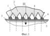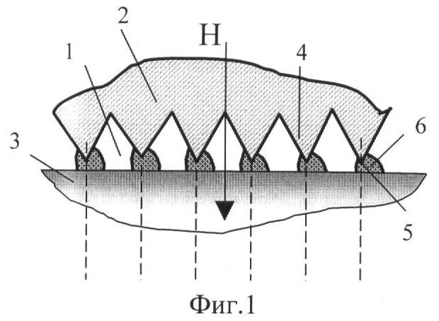 На фиг.1 показан пример реализации способа с помощью элементов-концентраторов, выполненных в виде зубцов треугольной формы с острыми кромками на магнитопроводящей поверхности, положение магнитожидкостных пробок в зазоре.