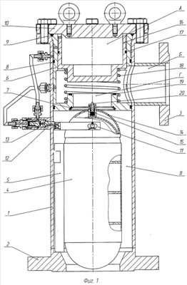 При дальнейшем заполнении магистрального трубопровода при прохождении газовоздушной пробки по магистральному трубопроводу ГВС заполняет поплавковую полость В, поплавок опускается, перестает нажимать на шток 12 пилотного клапана 13 и поршневая полость А соединяется с выходной полостью Б. Давление в поршневой полости А сбрасывается и пружина 18 отжимает поршень 16, открывая проходное отверстие Г.