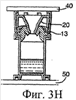 На фиг.3Н полку 40 опускают относительно нижней полки 50 и давят ей на пенетратор 20, как показано на фиг.2. Пенетратор 20 по меньшей мере частично проходит через крышку 13, упруго отодвигая назад эластичный материал крышки, прилегающий к проколотому отверстию 18.