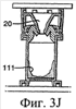 На фиг.3J замороженный раствор 17 при пониженной температуре подвергают действию пониженного атмосферного давления так, что пар от замороженной жидкости раствора 17 возгоняют и выводят наружу через пенетратор 20, оставляя материал в виде сухого лиофилизированного вещества 111.