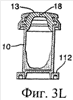 На фиг.3L узел 20, 30 отсоединяют от флакона 10. Для этой цели может быть использован демонтажный инструмент (не показан), и удобно, чтобы флаконы 10 имели нижний фланец 112, позволяющий удерживающему средству (не показано) тянуть флакон вниз против силы демонтажного инструмента, тянущей его вверх. Упругость крышки 13 снова приводит к закрытию проколотого отверстия 18.