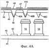 Фиг.4 и 5 иллюстрируют способ второго варианта выполнения и соответствующее устройство. На фиг.4 изображены флаконы 10 типа, описанного в международной публикации WO 04/018317. Флаконы расположены на обращенной вверх поверхности 40 нижней полки 41. Поверхность 40 снабжена центрирующими втулками 42, обычно конусами, которые входят в соответствующее гнездо в основании флаконов 10 для прочной фиксации флаконов 10 в заданном положении на полке 40. Имеется также соседняя по вертикали верхняя полка 43. Полки 41, 43 выполнены из металла, например нержавеющей стали. Из нижней поверхности 44 верхней полки 43 выходят пенетраторы 45А, 45В, 45С, 45D, 45Е. Каждый пенетратор 45А, 45В, 45С, 45D, 45Е содержит в целом конический элемент с вершиной, направленной вниз от нижней поверхности 44 верхней полки 43 к нижней полке 40. Каждый пенетратор 45А, 45В, 45С, 45D и 45Е представляет собой полый конус с отверстием 46 около вершины, с открытым основанием, так что его вершина может проходить через проницаемую область крышки 13 флакона 10 и пар жидкости-носителя может входить в вершину, проходить через полую внутреннюю часть конуса и выходить через открытое основание аналогично тому, как описано выше. Пенетраторы 45А, 45В и 45Е показаны в разрезе, чтобы проиллюстрировать их конструкцию. Пенетраторы 45А, 45В, 45С, 45D и 45Е выполнены из металла как единое целое с верхней полкой. Сверху и в контакте с верхней поверхностью 47 полки 43 находится стерильный фильтрующий лист 48, через который могут проходить газы, но не частицы, причем сам фильтрующий лист 48 удерживается на месте верхней пластиной 49 с отверстиями, проходящими сквозь нее, в положении, соответствующем положению открытых оснований пенетраторов 45А-Е. На фиг.4А пенетраторы 4А-С находятся в первом положении, в котором пенетраторы 4А-С находятся вне флаконов 10 и не проникают в крышки 13 флаконов 10. На фиг.4А пенетраторы 45В, 45С находятся в положении, аналогичном положению пенетраторов 20, показанных на фиг.3G.