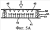 Со ссылкой на фиг.5 показано устройство, содержащее нижнюю полку 41 с флаконами 10 на ней, т.е. как показано на фиг.4. На фиг.5А верхняя полка 43 поднята так, что пенетраторы 45 находятся в первом положении, т.е. как на фиг.4А и 4С. На фиг.5В верхняя полка 43 находится в своем нижнем положении, так что пенетраторы 45 находятся в их втором положении, как показано на фиг.4В. Верхняя и нижняя полки 41, 43 смещены в это второе положение, как показано на фиг.5А, пружинами 51, расположенными в выдвижных трубчатых корпусах 53, 52. На фиг.5В пружины 51 находятся в сжатом состоянии. В устройстве, показанном на фиг.4 и 5, флаконы 10 могут быть расположены на нижней полке 41 при отсутствующей верхней полке 43, затем верхняя полка 43 может быть помещена над нижней полкой 41. Телескопические корпуса 53, 52 пружин помогают расположить пенетраторы 45 над флаконами 10 и направить пенетраторы 45 к флаконам 10, когда верхняя полка 43 опускается к нижней полке 41, противодействуя перемещению пружин 51. Верхняя полка 43 может быть удержана в положении, показанном на фиг.5В, противодействуя перемещению пружин 51 во время этапа испарения замороженной жидкости-носителя из флаконов 10 при помощи подходящего средства, например стопора.
