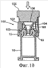Как показано на фиг.10, 11 и 12, пенетратор 100 установлен на флаконе 10 в положении, в котором пенетратор проходит через остаточное проколотое отверстие (не показано) в эластичной крышке 13 флакона 10 аналогично тому, как описано выше. Установка производится посредством монтажного инструмента 105, который производит давление вниз на пенетратор 100 для осуществления защелкивания защелки.
