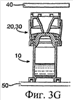 На фиг.3G монтажный инструмент 70 отсоединяют от узла 20, 30 и флакон 10 с узлом 20, 30 помещают на нижнюю полку 50 с верхней полки 40, расположенной выше по вертикали, с подобным массивом флаконов 10 (не показаны) на ней. Пенетратор 20 покоится на верхней части крышки 13.