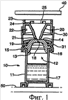 Посредством элемента 40, который расположен над узлом из флакона 10, пенетратора 20 и направляющей 30, пенетратор 20 показан перемещенным из первого положения, показанного на фиг.1, во второе положение, показанное на фиг.2. На практике на первой полке 50 расположены флаконы в виде двумерного массива, а другие полки с флаконами 10 (не показаны) расположены по вертикали над полкой 50. Элемент 40 содержит часть соседней по вертикали полки, которая давит на пенетратор 20 для приведения его во второе положение, показанное на фиг.2. Это может быть достигнуто путем размещения полок 40, 50 в стойке (не показано), которая поддерживает их с вертикальным зазором. Воротник 22 пенетратора 20 имеет верхнюю часть 23 с отверстиями 24, сообщающимися с отверстиями (не показаны) в направляющей 30. Через открытое основание конического элемента 20 проходит задерживающая мембрана 25, которая проницаема для газов, но препятствует прохождению частиц. Кроме того, верхний ободок части 23 может быть выполнен зазубренным.