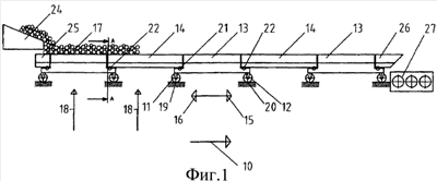 На фиг.1 также видно, что горячий охлаждаемый цементный клинкер 17, падающий из разгрузочного конца вращающейся трубчатой печи, вначале через статическую неподвижную предрешетку 24 соскальзывает на совершающий возвратно-поступательное движение концевой элемент 25, который посредством шарнира сцеплен с передней стороной первого несущего модуля 13. К последнему несущему модулю 13 может быть присоединен концевой модуль 26, через который охлажденный цементный клинкер передается на валковую дробилку 27.