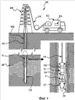 На фиг.1 схематически также показан увеличенный вид участка обсаженного ствола скважины, в котором прибор TL установлен в заданном положении с помощью центратора СТ. Прибор TL содержит поворотное устройство, например вертушку 2 расходомера, соединенную с расходомерным зондом FS (эта часть устройства для измерения скорости и направления потока флюида согласно изобретению будет описана более подробно ниже). Скорость и направление вращения вертушки зависят от количества флюида FF, протекающего на уровне прибора. На фиг.1 показан ствол скважины, которая является продуктивной скважиной, то есть скважиной, из которой добывают нефть и газ, протекающие к поверхности (по стрелкам, направленным вверх). Однако ствол скважины также может относиться к нагнетательной скважине, то есть к скважине, в которую флюид закачивают с поверхности в геологическую формацию.
