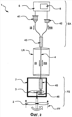 Лазерный источник 2041 связан с первым формирователем 2045А пучка посредством первого оптического волокна 2004А. Детектор 2042 связан со вторым формирователем 2045В пучка посредством второго оптического волокна 2004В. Первый 2045А и второй 2045В формирователи оптического пучка задают между собой свободное пространство небольшой протяженности (около нескольких миллиметров). Модулятор 2003 расположен в этом свободном пространстве так, что пучок может модулироваться информацией, относящейся к вращению вертушки. Первое оптическое волокно 2004А и первый формирователь пучка 2045А обеспечивают подведение падающего пучка IB от лазерного источника к модулятору. Второе оптическое волокно 2004В и второй формирователь 2045В пучка обеспечивают подведение обратного пучка RB от модулятора к детектору.