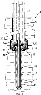 Охлаждающая вода создает корку 20 затвердевшего вещества вокруг штанги 1 и под ней. Эта корка покрывает прокладки 13 и 14 из оксида алюминия и защищает их от плавления. Это объясняется тем, что охлаждающий контур 5 почти доходит до места соединения штанги 1 с насадкой 15 и камерой 6, примыкающей к полости 10. Термопара 9 подвергается воздействию температуры, которая почти не испытывает влияния охлаждения. Крепление насадки 15 на штанге 1 осуществляется путем напрессовывания внутреннего фланца 11 на внешнюю часть 16, а сохранение этого крепления гарантируется фланцем 18, размещенным в пазу 12.
