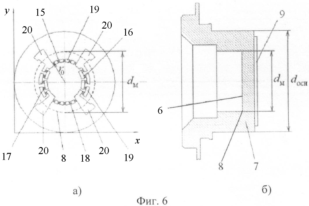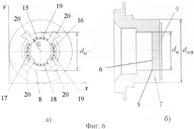 В гетерогенной структуре 9 (фиг.6а, б) образованы тензорезисторы 15-18 (фиг.6, а), установленные по дуге окружности (15, 18) и в радиальном направлении (16, 17), состоящие из идентичных тензоэлементов в форме квадратов, соединенных тонкопленочными перемычками 19. Тензорезисторы 15-18 объединены в измерительный мост. Контактные площадки 20 служат для подключения напряжения питания и съема выходного сигнала с измерительного моста из тензорезисторов 15-18.