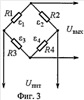 Очевидно, что при расположении окружных и радиальных тензорезисторов на периферии мембраны в области различных по величине относительных деформаций  и r, относительные изменения сопротивлений окружных и радиальных тензорезисторов будут различны. При этом возникает нелинейность измерительной цепи датчика, которая зависит от коэффициента симметрии k и относительных изменений сопротивлений плеч измерительной цепи 1, 2, 3, 4 [5]. На фиг.3 показан измерительный мост с тензорезисторами R1, R2, R3 и R4, которым соответствуют относительные изменения сопротивлений 1 2, 3, 4 при воздействии деформаций.