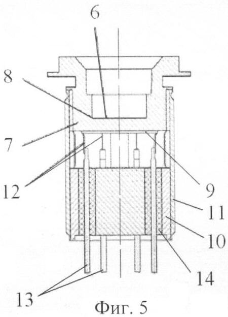 На фиг.5 отдельно показана тензорезисторная тонкопленочная нано- и микроэлектромеханическая система (НиМЭМС) датчика. Она состоит из упругого элемента – круглой мембраны 6, жестко заделанной по контуру, с периферийным основанием 7 за границей 8 мембраны, гетерогенной структуры 9, контактной колодки 10, герметизирующей втулки 11, соединительных проводников 12, выводных колков 13, диэлектрических втулок 14. Гетерогенная структура 9 из тонких пленок материалов (тонкопленочные диэлектрические, тензорезистивные, контактные и т.п. слои материалов) сформирована на мембране 6 методами нано- и микроэлектронной технологии.