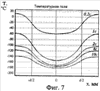 При измерении давления в условиях воздействия нестационарной температуры измеряемой среды, например, при воздействии на датчик, установленный на агрегате жидкостного реактивного двигателя, находящегося в нормальных климатических условиях, давления жидкого кислорода или водорода, на поверхности мембраны возникает нестационарное температурное поле. Нестационарное температурное поле возникает и при резком воздействии на датчик жидкого азота. На фиг.7 представлен график температурных полей на мембране в различные моменты времени с начала действия термоудара (воздействие жидкого азота) для случая, когда окружающей средой между мембраной и корпусом датчика является вакуум. Кривые построены для мембраны с диаметром d=5 мм, заделкой z=1,5 мм, толщиной h=0,31 мм с использованием алгоритма и программы [7].