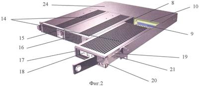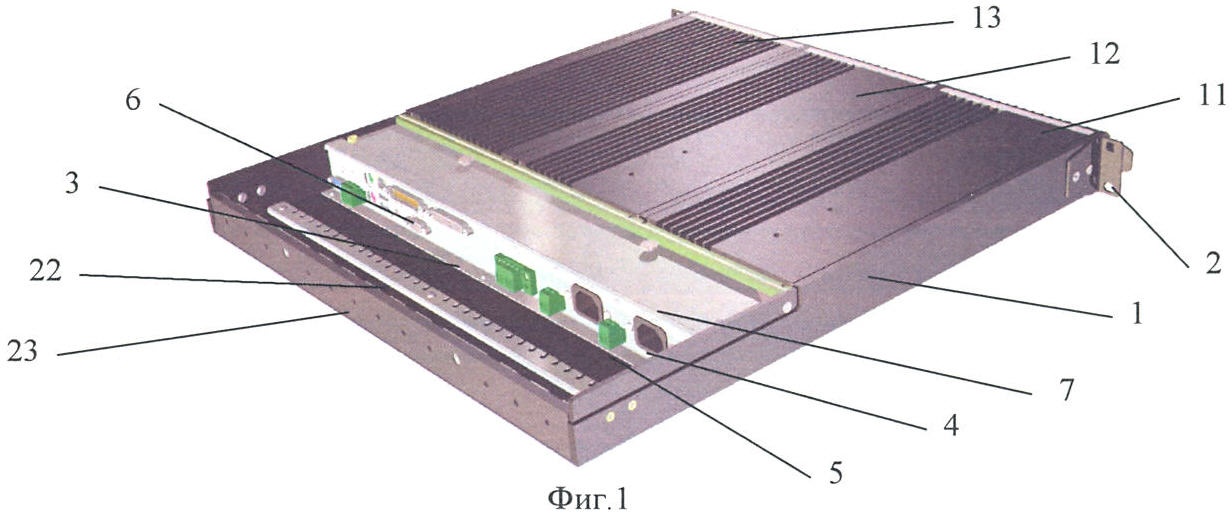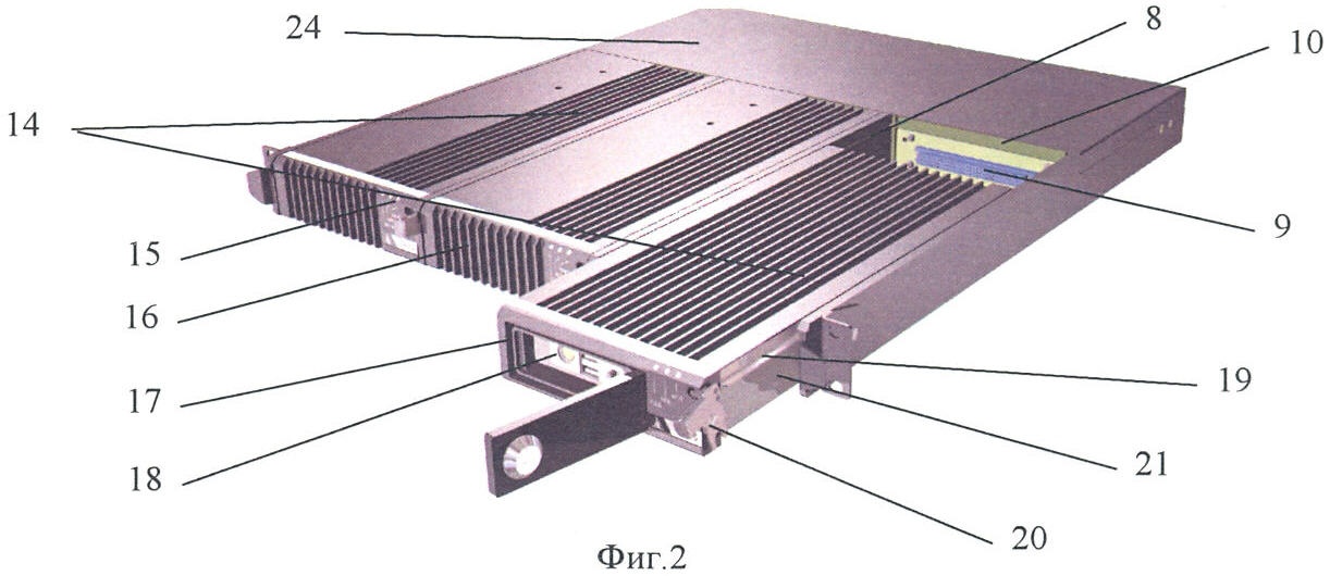 Модули 11, 12, 13 являются функционально законченными устройствами, способными работать самостоятельно, оснащены ребристыми верхними стенками 14, а модули питания ребристой лицевой панелью 16, выполняющими роль охлаждающих элементов, площадь которых выполнена пропорционально выделяемой модулем мощности. Лицевая панель компьютерного модуля оснащена запираемой дверцей 17, за которой размещена интерфейсная панель 18 с кнопками управления и разъемами дополнительных устройств, таких как клавиатура, устройства обмена данными и других. Каждый модуль оснащен П-образным кожухом 21 из листового материала, например стали. Кромка кожуха в рабочем положении входит в паз с эластичным уплотнителем, предусмотренный на стенке 10 с разъемами 9 каркаса, обеспечивая защиту соединения от внешних воздействий.