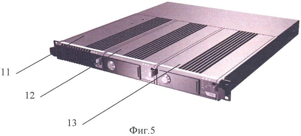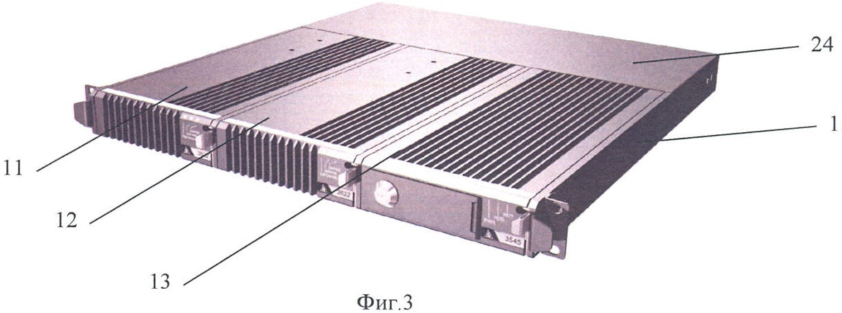 Сущность изобретения поясняется чертежами фиг.1-5, на которых изображен контроллер высотой 1U, выполненный в виде модульной конструкции, включающей в себя каркас 1, снабженный кронштейнами 2 с отверстиями для крепления в шкафу 19 , задней панелью 3 с разъемами питающей сети двух видов 4, 5 и другими разъемами 6 для подключения внешних устройств, встроенной системой управления питанием 7, направляющими пазами 8, разъемами 9 на стенке 10 каркаса для подключения сменных модулей. Три сменных функционально законченных модуля 11, 12, 13, например (Фиг.4) модуль питания 11, модуль сопряжения с объектом 12 и модуль компьютерный 13, или (Фиг.3) – два модуля питания 11, 12 и модуль компьютерный 13, или (Фиг.5) – модуль питания 1 и два модуля компьютерных 12, 13. Модули 11-13 оснащены ребристой верхней стенкой 14, индикаторами состояния 15, лицевой панелью, ребристой 16 или с дверцей 17, за которой расположена интерфейсная панель 18 с направляющими полозьями 19 на боковых стенках и специальным рычагом 20 для облегчения установки и снятия модуля. Снизу содержимое функционального модуля закрыто кожухом 21 из листового материала, например стали. Разъемные соединения со стороны задней панели 3 расположены в отсеке, снабженном элементом крепления кабелей 22, и защищены эластичным пластинчатым кабельным вводом 23, например, из резины и металлической крышкой 24 с двумя невыпадающими винтами.