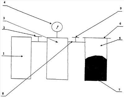 В емкость 5 всыпают высушенный грунт 7, закрывают герметичную крышку 6, закрывают кран 9, открывают кран 2, впускают сжатый воздух из компрессора 1 в емкость 3, снимают показания манометра 4, открывают кран 9, снимают показания манометра 4, определяют объем частиц грунта по формуле: