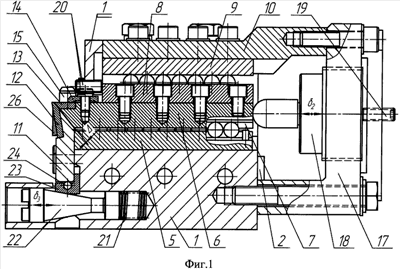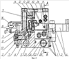 Такой способ крепления накладки 13 обеспечивает ее быструю смену и приводит к повышению достоверности и точности измерения длин контактов стружки с передней гранью резца 11 при резании материалов. К верхней поверхности пластины 6 прикреплена тяга 15, соприкасающаяся с датчиком для регистрации перемещений 16, установленным в корпусе 1, что позволяет контролировать изменение зазора между режущей пластиной 12 и накладкой 13, а следовательно, повысить точность измерения сил трения и длин контактов стружки с передней гранью резца 11 при резании материалов. К крышке верхней 10 и корпусу 1 прикреплена крышка задняя 17, в которую устанавливается датчик для регистрации сил 18 до соприкосновения с пластиной 6 и контрится винтом 19, вставленным в крышку заднюю 17. Датчик для регистрации сил 18 имеет возможность перемещения в горизонтальном направлении 2 с одновременным вращением вокруг своей оси симметрии, что позволяет регулировать в горизонтальном направлении зазор между режущей пластиной 12 и накладкой 13, а следовательно, повысить точность измерения сил трения и длин контактов стружки с передней гранью резца 11 при резании материалов. В верхнюю часть корпуса 1 вставляются установочные элементы 20, состоящие из винта и стопорной гайки, для обеспечения постоянного зазора между режущей пластиной 12 и накладкой 13. Также установочные элементы 20 прижимают пластину 6 к датчику для регистрации сил 18, что обеспечивает безынерционное измерение сил трения при перемещении пластины 6, а следовательно, достоверность измерения сил трения стружки с передней гранью резца 11 при резании материалов. В нижней части корпуса 1 располагаются горизонтально и симметрично относительно его вертикальной плоскости симметрии цилиндрические отверстия, в которые устанавливаются пружины 21, служащие для поджатия винтов 22, имеющих конические поверхности и установленных в отверстия до соприкосновения с ними, к корпусу 1. Винты 22 имеют возможность перемещения в горизонтальном направлении 3 с одновременным вращением вокруг своей оси симметрии. На конические поверхности винтов 22 вертикально устанавливаются пальцы 23, в верхней части которых расположены отверстия для установления в них сферических тел 24 в виде шариков, что позволяет регулировать в вертикальном направлении зазор между режущей пластиной 12 и накладкой 13, а следовательно, повысить точность измерения сил трения и длин контактов стружки с передней гранью резца 11 при резании материалов. При этом расположение сферических тел 24, установленных в отверстиях пальцев 23, позволило перейти от контакта резца 11 с пальцами 23 по плоскости к контакту резца 11 со сферическими телами 24 в точке, а это, в свою очередь, повышает точность установки резца 11 в вертикальной плоскости, а следовательно, достоверность измерения сил трения стружки с передней гранью резца при резании материалов. На сферические тела 24 устанавливается резец 11 и прикрепляется к корпусу 1. Между резцом 11 и корпусом 1 вертикально и симметрично относительно их вертикальной плоскости симметрии устанавливаются эластичные элементы 25 для обеспечения постоянного контакта резца 11 со сферическими телами 24, что повышает точность регулирования по высоте резца 11, а следовательно, достоверность и точность измерения длин контактов стружки с передней гранью резца 11 при 