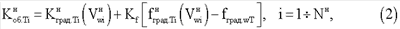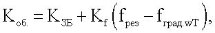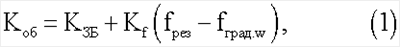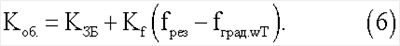 Алгоритм для диэлькометрического метода состоит в следующем. Как было указано выше, исходной информацией, получаемой с помощью РВД, являются измеренные значения величин резонансных частот и коэффициентов передачи. Текущие значения резонансной частоты fрез объемного резонатора и коэффициента передачи KЗБ на резонансной частоте, а также температура T используются при диэлькометрическом методе для формирования обобщенного параметра Kоб с привлечением значения резонансной частоты fград.w, соответствующей заполнению резонатора при градуировке водой, по формуле: