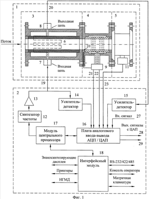 Электронный блок включает в себя синтезатор частоты 12; усилитель 13, усилители-детекторы 14 и 15, плату аналогового ввода-вывода 16 с многоканальным аналого-цифровыми преобразователем (АЦП) и многоканальным цифроаналоговым преобразователем (ЦАП); модуль центрального процессора 17; интерфейсный модуль 18 (может входить в состав модуля центрального процессора).