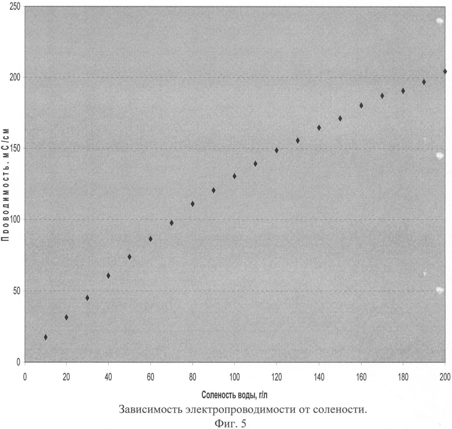 Как говорилось выше, электропроводимость смеси зависит не только от относительно содержания воды в смеси, но и от ее солености. На фиг.5 приведена экспериментальная зависимость электропроводимости воды от содержания солей (NaCl).