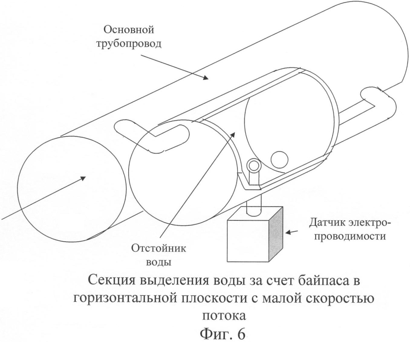 Конструктивное решение, показанное на фиг.6, обеспечивает отстой и автоматическое обновление пластовой воды благодаря малой скорости потока в параллельном основному трубопроводу участке, достигаемой за счет поступления в него и отвода из него измеряемой смеси через трубки малого сечения. Рабочий участок трубопровода и параллельный с отстоем воды располагаются в горизонтальной плоскости.