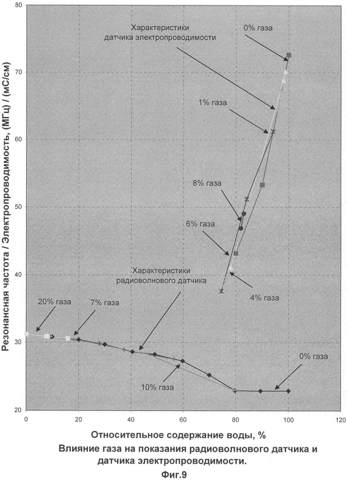 На фиг.9 представлены зависимости резонансных частот РВД и удельной электропроводимости, измеряемой датчиком электропроводимости, от влагосодержания при различном количестве свободного газа в измеряемой среде.