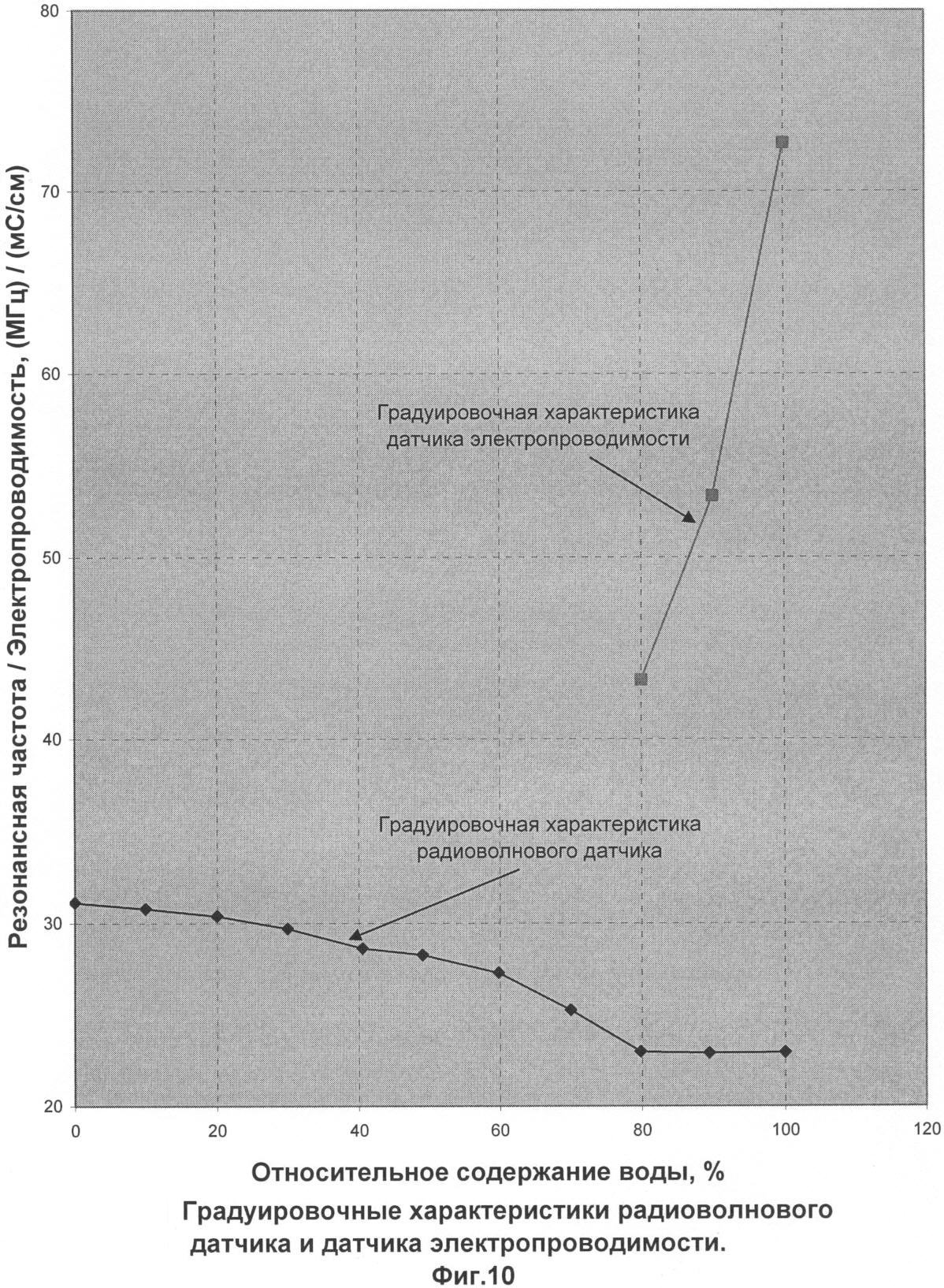 Кривые из этого семейства, относящиеся к отсутствию в среде свободного газа, используются в качестве градуировочных. Они представлены отдельно на фиг.10 как «градуировочные характеристики радиоволнового датчика» и «градуировочные характеристики датчика электропроводимости». Как видно из семейства этих характеристик, они практически совпадают друг с другом, что свидетельствует о незначительном влиянии свободного газа на показания влагомера.
