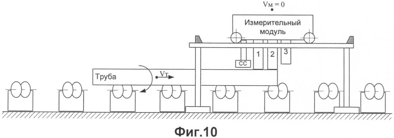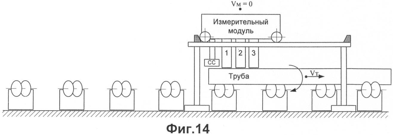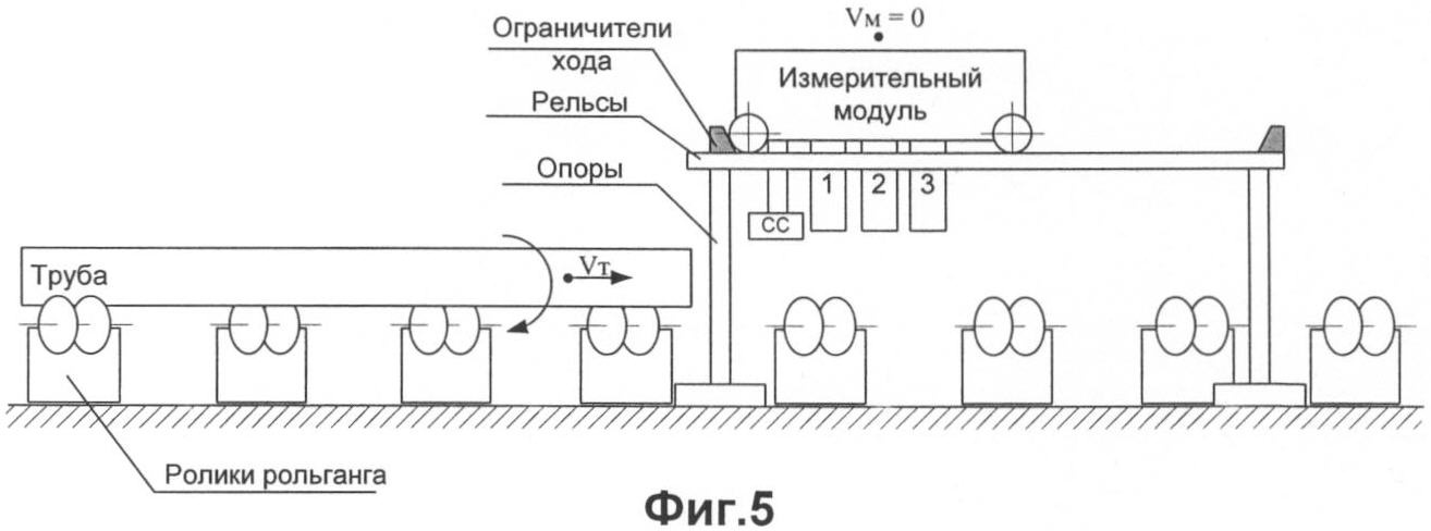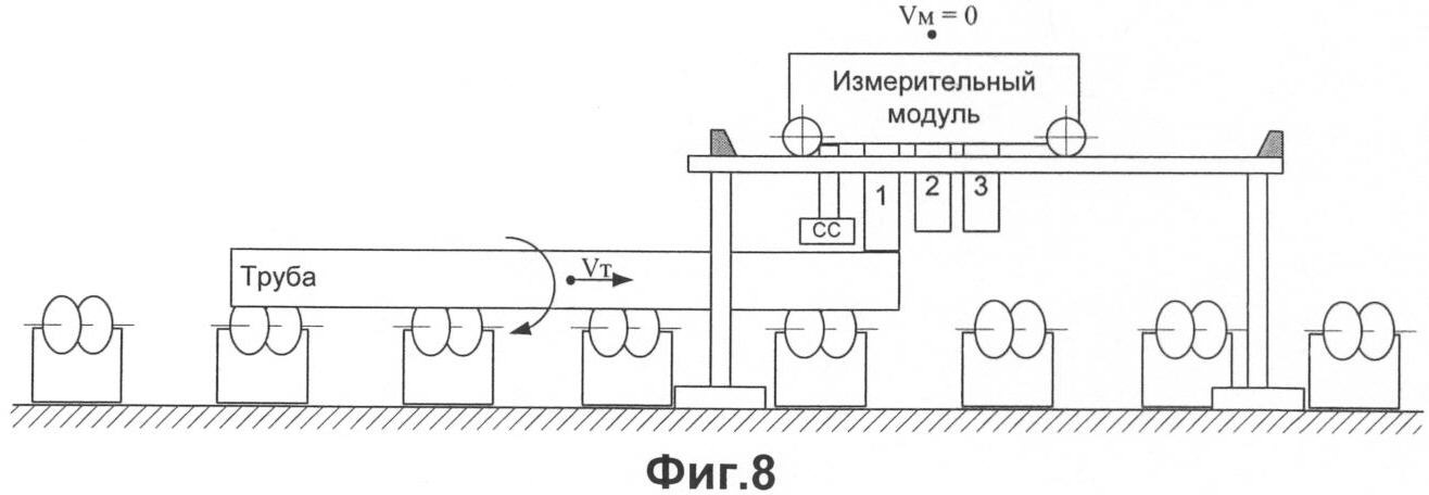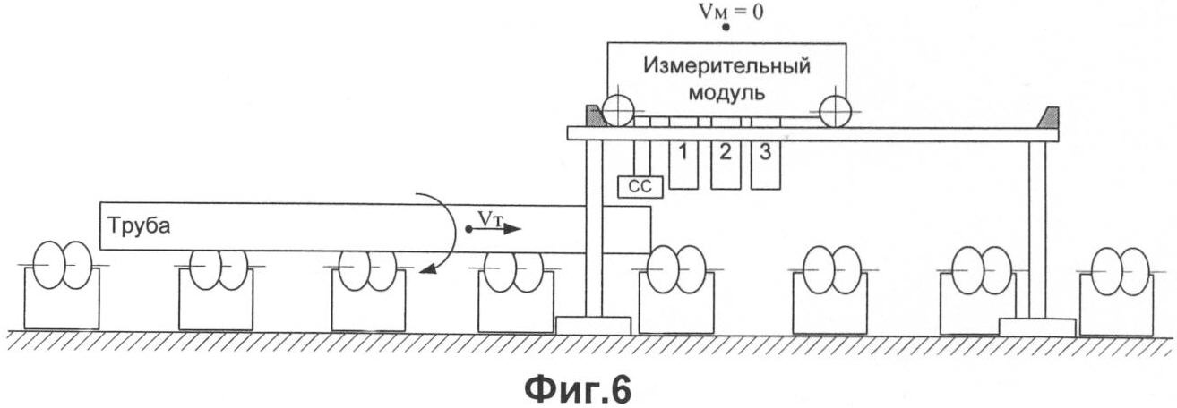 Измерительный модуль (ИМ) ожидает трубу, находясь в исходном положении, с поднятыми акустическими преобразователями (фиг.5), где 1 – акустический преобразователь АП1, 2 – акустический преобразователь АП2, 3 – акустический преобразователь АП3, СС – система слежения за трубой. Труба движется вращательно-поступательно, с поступательной скоростью Vт и вращательной скоростью, равной скорости контроля, оговоренной в соответствующих стандартах, регламентирующих проведение УЗК. Когда передний конец трубы достигает системы слежения (СС), автоматически определяется поступательная скорость движения трубы (фиг.6). Система слежения за трубой представляет собой комплекс датчиков и прочих средств автоматизации, позволяющий определить положение конца трубы в каждый момент времени, а также вычисляющий поступательную скорость движения трубы.