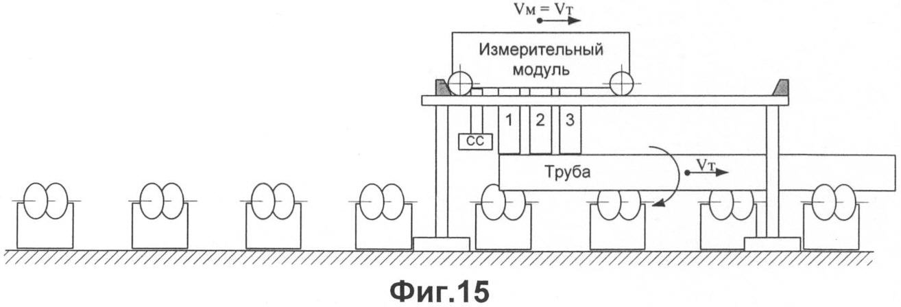 Фиг.15 – когда АП1 окажется на заднем конце трубы, измерительный модуль начинает движение в направлении перемещения трубы со скоростью, равной скорости трубы.