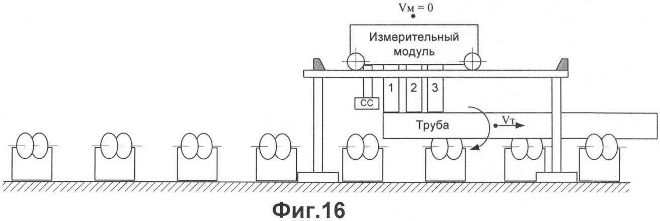 В момент, определенный системой слежения, когда АП1 окажется на заднем конце трубы, измерительный модуль начинает движение в направлении перемещения трубы со скоростью, равной скорости трубы (фиг.15). Равенство скоростей Vм и Vт позволяет акустическому преобразователю АП1 в течение одного оборота проконтролировать по окружности весь задний конец трубы без неконтролируемой зоны. После того, как труба сделала один оборот, измерительный модуль останавливается. При этом труба продолжает перемещаться вращательно-поступательно (фиг.16).